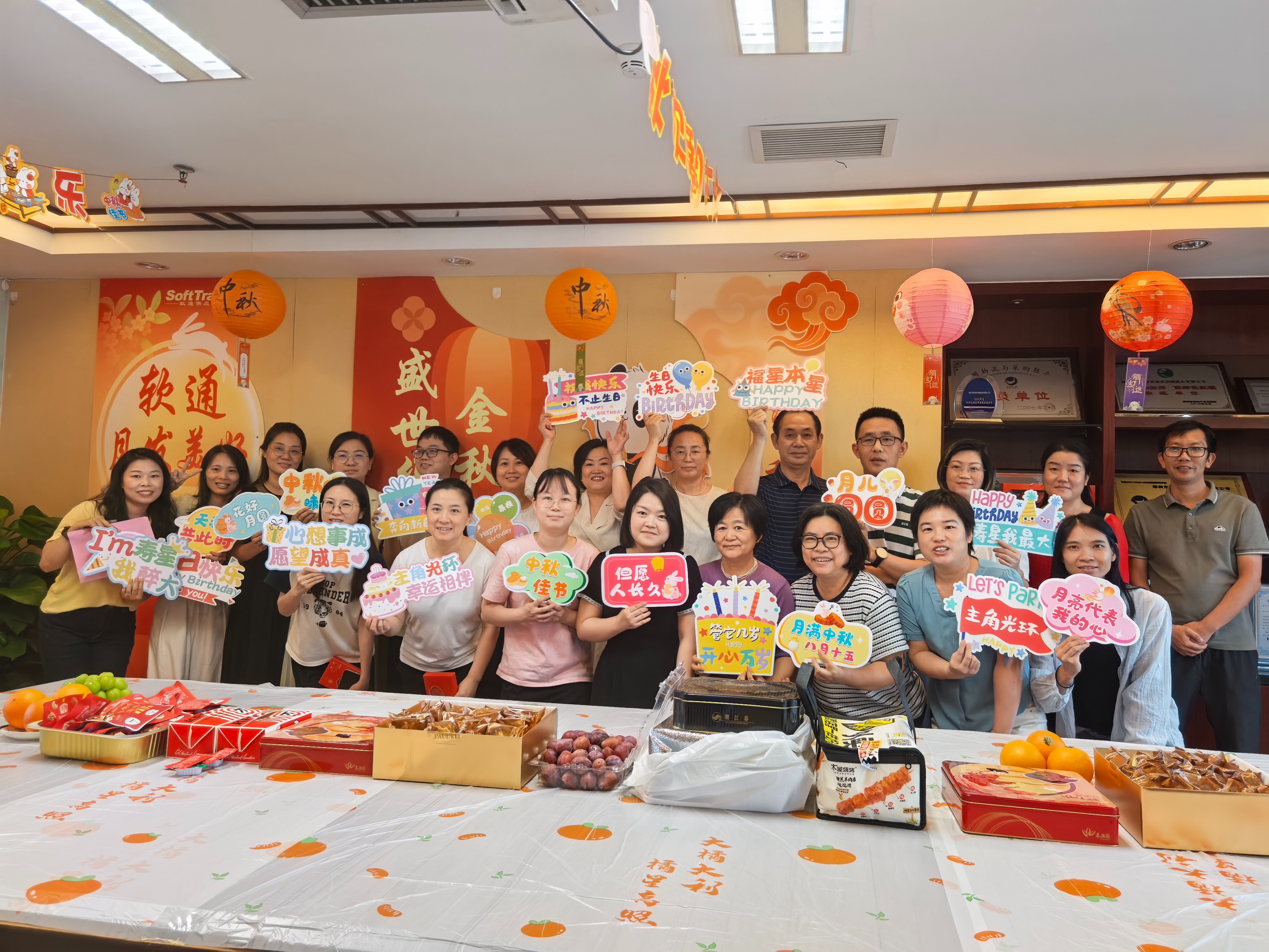 金秋送爽,桂香浮动。为弘扬中华优秀传统文化、营造温馨和谐的企业氛围,传递公司对员工的深切关怀,深圳软通公司于9月25 日、26 日下午,分别在总部办公大楼和平湖仓库圆满举办 “情浓中秋 月發美好” 主题文化活动暨 2025 年下半年员工生日庆祝会。活动将传统节日习俗与员工关怀深度融合,现场欢歌笑语不断,暖意满溢。 活动在温情氛围中拉开帷幕。公司董事长陈思远先生、总经理臧建伟先生先后致辞,向全体员工致以诚挚的中秋及国庆双节问候,肯定了大家上半年的辛勤付出与工作佳绩,寄语软通团队一如既往地保持同心共进的劲头,发扬 “TEAM WORKS WONDER” 精神,携手推动公司发展更加欣欣向荣,共同迈向新台阶。